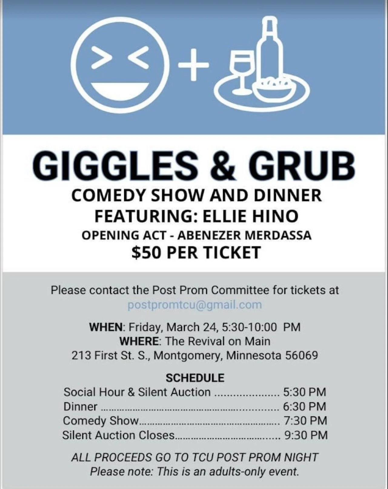 Giggles & Grub Friday, March 24, 2023 5:30 PM 10:00 PM 17:30 22:00 Google Calendar ICS Giggle & GrubPlease contact the Post Prom Committee for tickets at PostPromTCU@gmail.com